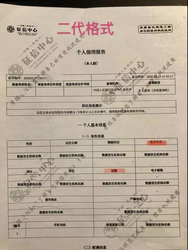 央行征信中心已于2020年1月17日启动二代征信系统切换上线工作。1月19日起,征信中心面向社会公众和金融机构提供二代格式信用报告查询服务。今日,不少市民通过个人信用报告自助查询机拿到了自己第一份二代格式的信用报告。北京青年报记者看到,相比一代格式,二代格式信用报告展示版面更加明确清晰,一目了然;展示的信息数量明显增加,报告篇幅也长了不少。