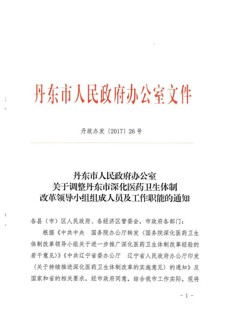 近日,bt365体育在线备用_365国际体育官网_365bet亚洲城政府办公室印发了《关于调整bt365体育在线备用_365国际体育官网_365bet亚洲城深化医药卫生体制改革领导小组组成人员及工作职能的通知》(丹政办发[2017]26号)文件。