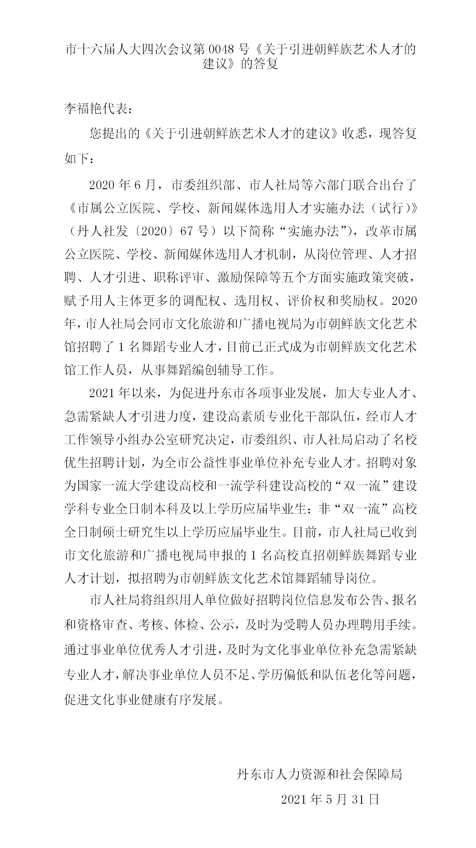 市十六届人大四次会议第0048号《关于引进朝鲜族艺术人才的建议》的答复